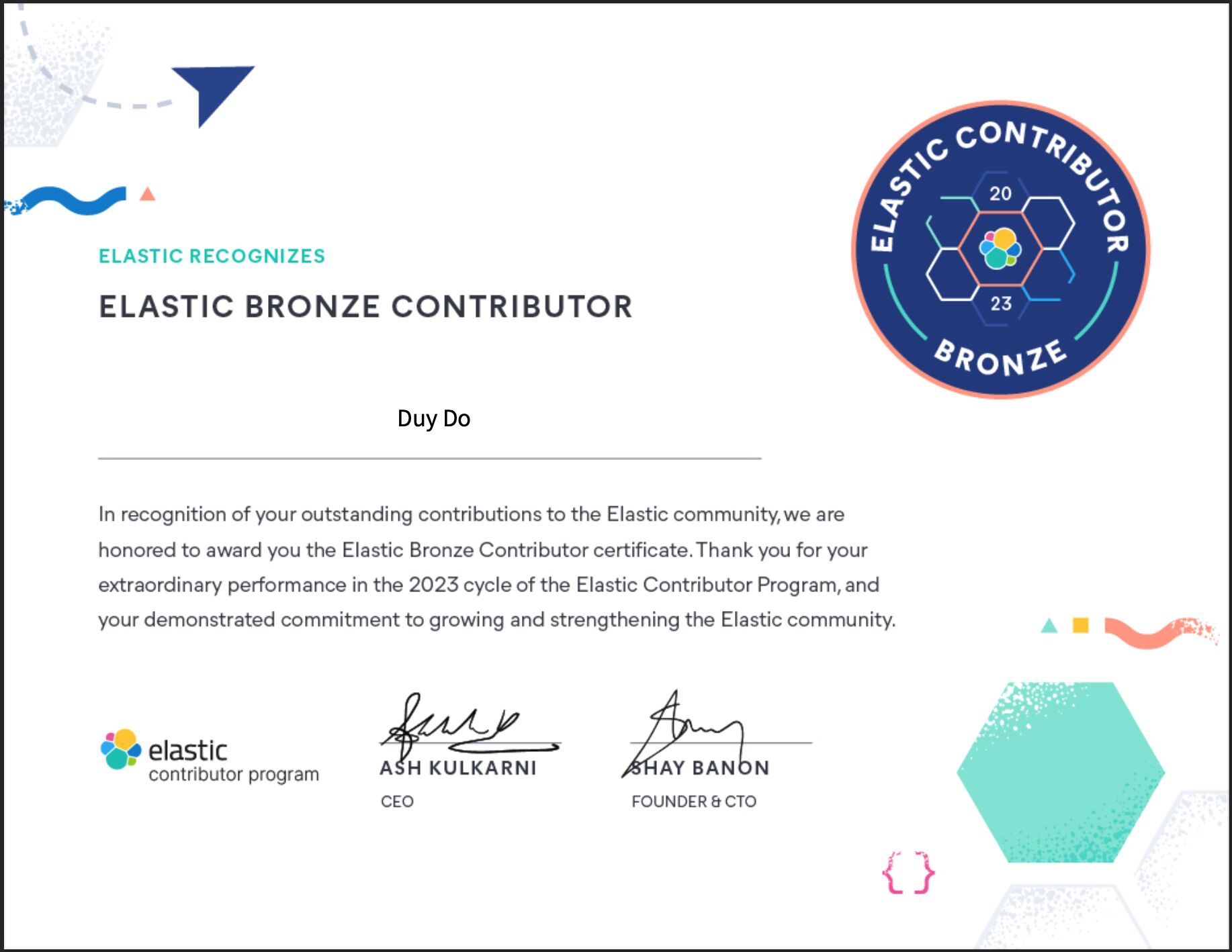 I’m thrilled to share that I have been recognized as an Elastic Bronze Contributor for 2023. This achievement is a reflection of my commitment to the open-source community and a testament to the valuable work being done in the Elasticsearch ecosystem.